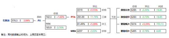截至本周(20250418-0423),產業鏈價格整體呈現上漲,石腦油、PX、PTA環比分別+3.94%、+1.60%、+0.55%。聚酯產品跟進不足陰跌出貨為主,長絲、切片、短纖環比分別-2.26%、-0.78%、-0.73%,僅瓶片環比+0.39%。利潤方面,PXN周均環比-5.76%至165.9美元/噸,PTA加工費同步收窄,環比-11.79%至281元/噸。聚酯板塊權限虧損。