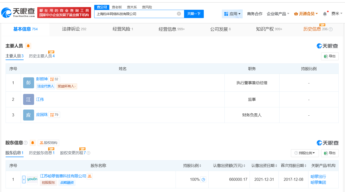 天眼查App顯示,近日,上海鈞豐網絡科技有限公司發生工商變更,注冊資本由61億元人民幣增至約66億元人民幣。該公司成立于2016年3月,法定代表人為彭照坤,經營范圍包括機械設備租賃、共享自行車服務、計算機系統服務等財盈策略,由江蘇哈啰普惠科技有限公司全資持股。